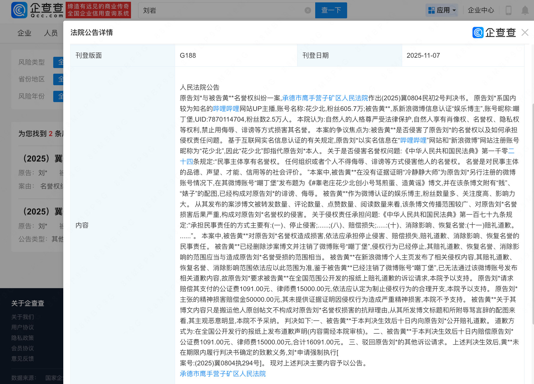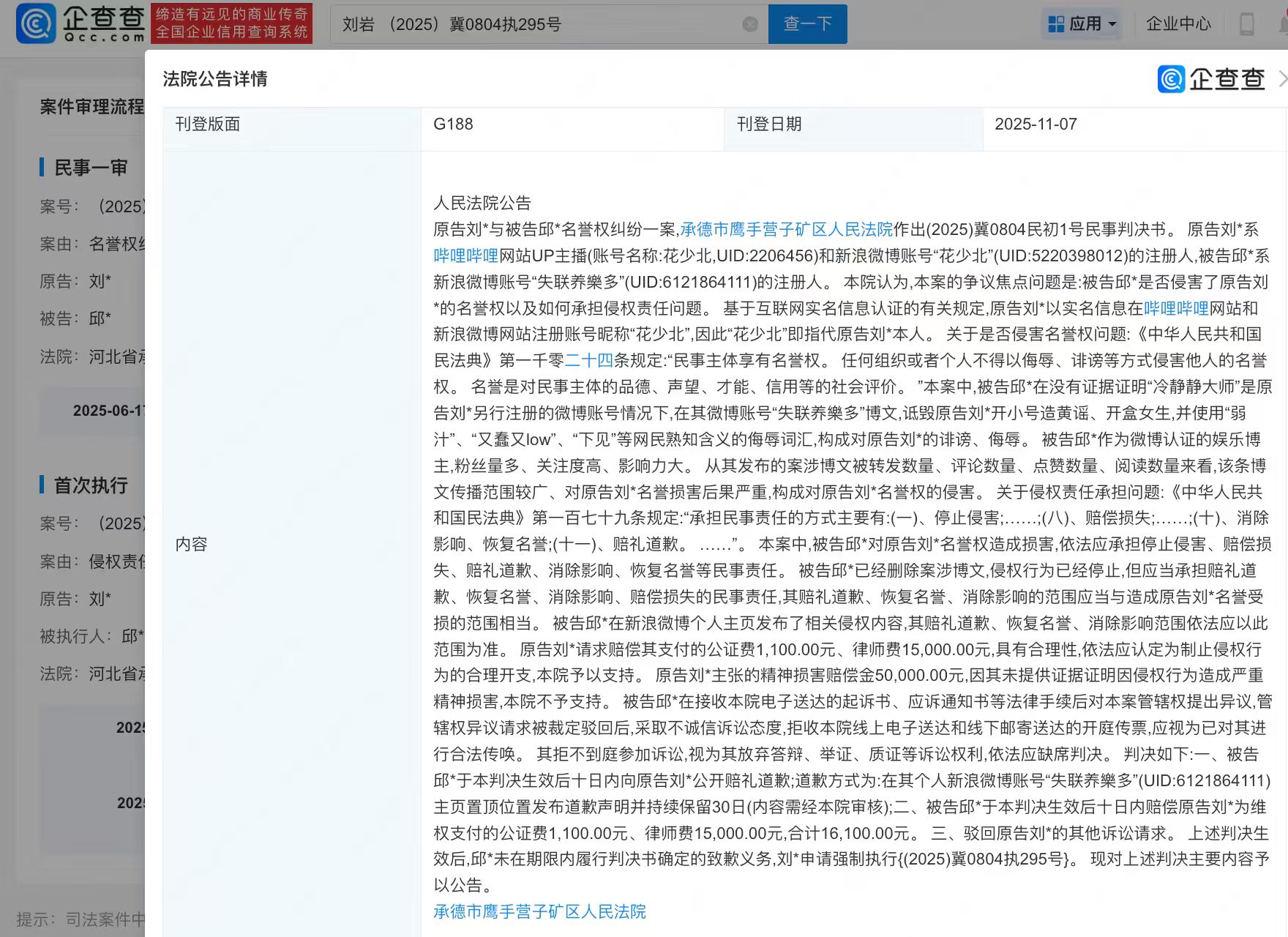 近日,法院刊登B站游戏区UP主花少北(刘岩)与两人名誉权纠纷案件,因两被告未履行致歉义务,花少北申请强制执行。判决内容显示,被告在无证据证明情况下,诋毁花少北开小号造黄谣、开盒女生,并使用侮辱词汇,构成诽谤、侮辱等,法院判决两被告向原告公开赔礼道歉,并分别赔偿维权费用1.6万元,其中花少北主张精神损害赔偿金5万元,其未提供证据证明因侵权行为造成严重精神损害,法院不予支持。公开信息显示,花少北当前粉丝数超570万,连续四年获得“BILIBILI百大UP主”称号,曾因发文官宣恋情引发热议,承认与前女友煎蛋七年恋爱并表示与煎蛋金钱上互有往来,并未亏待煎蛋,还帮助煎蛋找过工作。